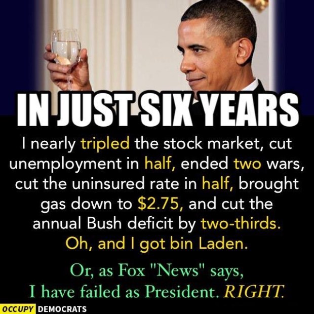What is not mentioned in this meme is that even as he wound down two wars, he started two new wars in Syria and Libya. He destroyed those two countries and caused exactly the same problems that Bush II caused – more terrorism, millions of refugees, and hundreds of thousands killed.