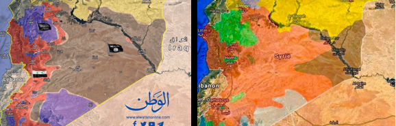 As for the war itself, Syria has made massive gains since the beginning of the year. However, as you can see below, there are still many colors within the borders: red – Syrian government; brown – ISIS; yellow –Kurds; green/purple – Al Qaeda.