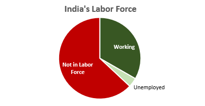 The labor force in India is only 500 million. Take away the 10% who are unemployed, you get 450 million. That means about 900 million Indians — or 2/3rd of the population — are not working. This is not a good recipe for economic growth.