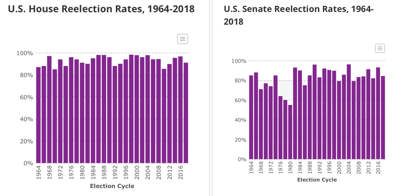 Given all these terrible statistics, you would think that Americans will keep firing Congressmen and Senators. Alas, you would be wrong! More than 90% of senators and 95% of congressmen get re-elected every year!
