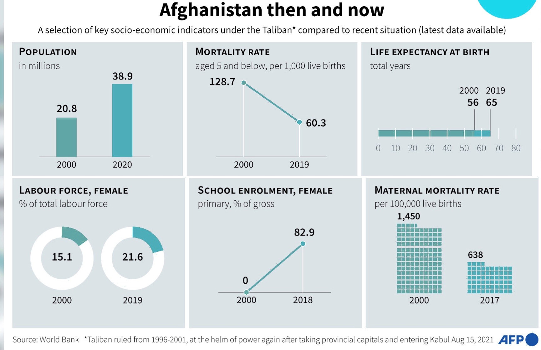 Note that, while the U.S. gets a lot of bad rap, Afghanistan’s population doubled in the last 20 years, life expectancy grew by 9 years, child mortality fell by 50%, and millions of girls were able to attend schools.