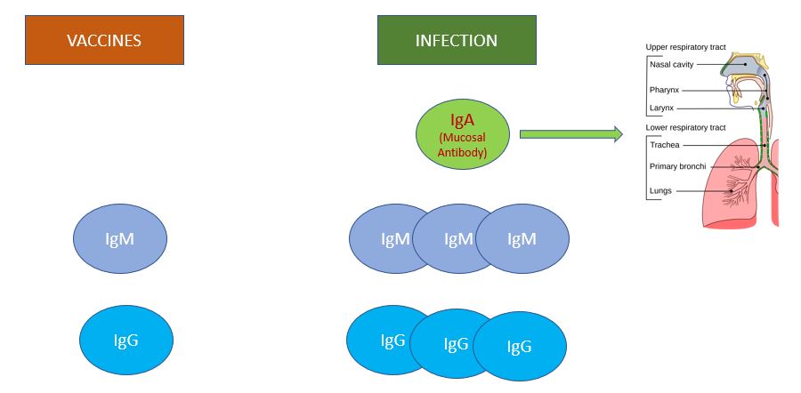 When you get infected with COVID, your body makes a lot of IgA in the mucosal membrane of nose, throat, trachea, lungs etc. This coating of antibody protects you from future infections, since the virus gets stopped before it can enter your body. IgA is like the missile defense system.