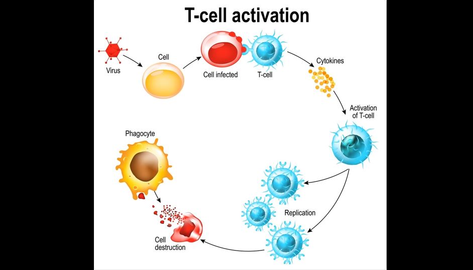 The T cells, which are roaming all over your body, notice the abnormal proteins on the cell and do two things: (1) Pass on the information about each antigen to the B cells, who make antibodies, and (2) Kill the infected cells as well as the virus inside them.