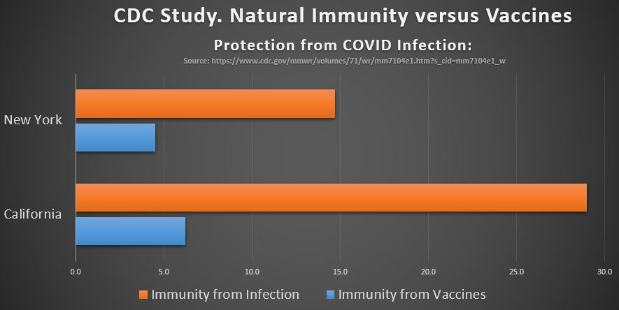 Specifically, the CDC study shows that, in states like California and New York, infection was 5 times or more better than vaccines in reducing infections and hospitalization. In Rhode Island, COVID infections reduced hospitalization by 6x and deaths by staggering 28x, when compared to two doses of vaccines.