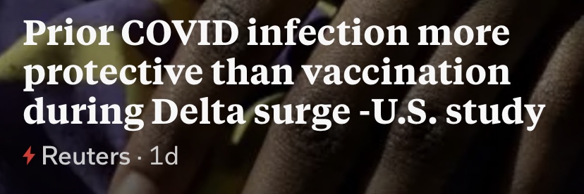 Update: After two years of obfuscation, the CDC and the medical profession are finally talking about natural immunity from infection. And guess what, it is actually better than the vaccines — in this study for delta variant. Until few days ago, you would have gotten banned on social media as a conspiracy theorist for saying that “prior COVID infection is more protective than vaccination”!!