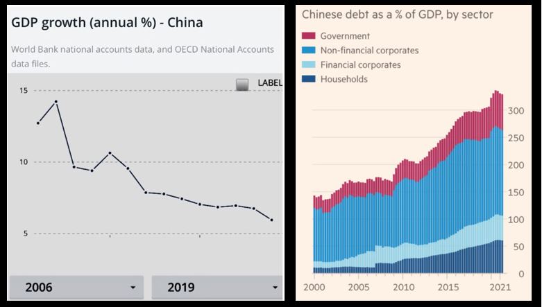 Gone are the days of double-digit growth. The average GDP growth for 2020 and 2021 combined was 5.1%. This year will be about the same as well. By the end of this decade, the GDP growth will be around 3%, slightly above developed countries. Meanwhile, China’s cumulative debt has risen to an unsustainable level over the last decade and will continue to explode.
