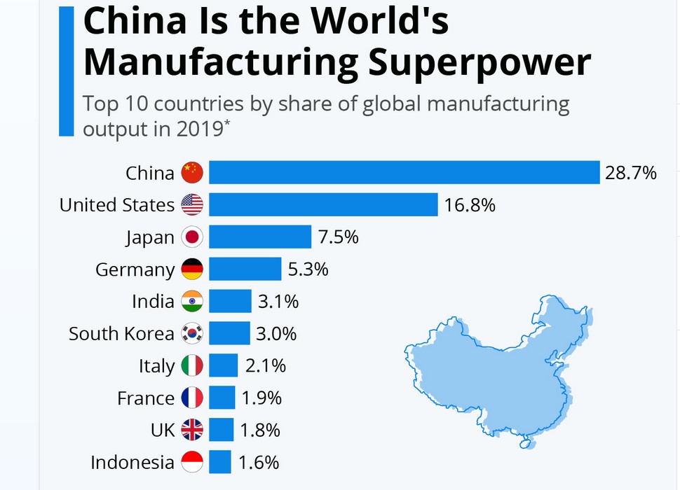 As China gets older and more expensive, there will be some shift in manufacturing, but it will be a gradual process, since China dominates the sector. China accounts for 29% of global manufacturing and 21% of global exports of goods.
