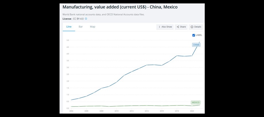 On the other hand, re-globalization will be a slow process, since it involves a lot of new investment and changes to existing logistics. It’s not easy. Take Zeihan’s crazy idea that the US can easily move manufacturing from China to Mexico. It’s impossible. China’s manufacturing output is 20x that of Mexico — $4.8 trillion versus $232 billion. That means, to move just 5% of Chinese manufacturing to Mexico, the output of Mexico has to double! The last time, it took Mexico 20 years to double their manufacturing output. (chart). So, it’s mission impossible. Plus, 62% of Mexico’s workforce is in services. Once people go into services, it’s impossible to get them back into factory jobs (or farming). Link for chart below: