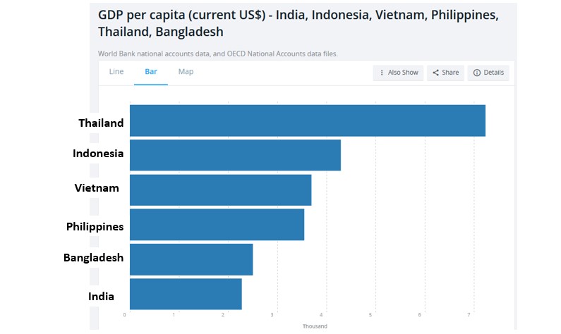 While India is far behind China, the failure to grow fast is obvious looking at other developing countries in Asia. Compare India’s GDP-per-capita to other developing Asian countries like Thailand, Indonesia, Vietnam, Philippines and even Bangladesh: