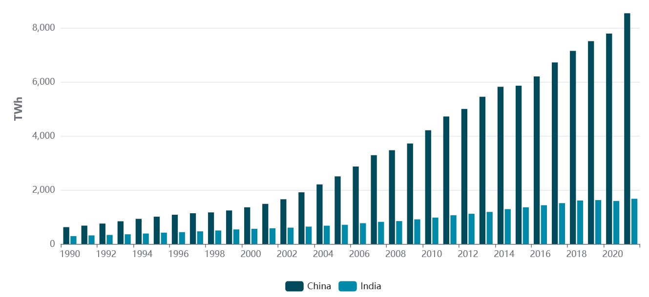 In electricity generation, China is 5.3x India, pretty much the same as the GDP ratio.