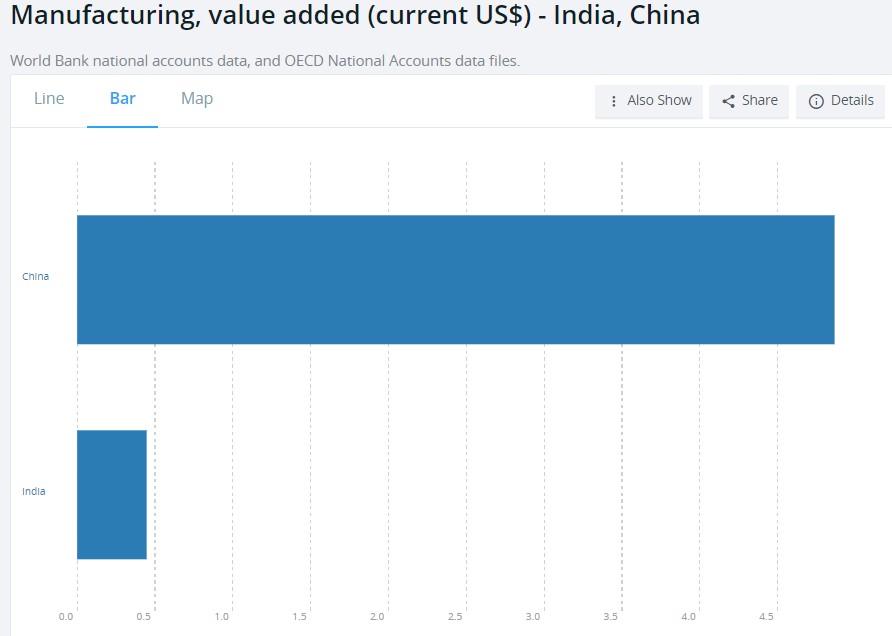 How do all these factors combined help China? Its manufacturing value added is staggering 10 times larger than India’s!