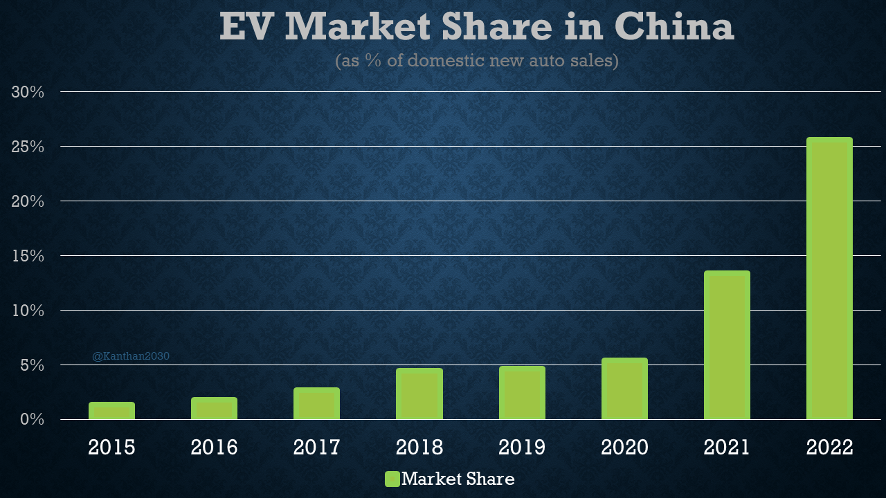 - China had a record year for EV sales! China’s production of electric vehicles in 2022 exploded to 6.5 million — 60% of the global market share! Pure battery electric cars accounted for 20% of new car sales in China in 2022. Plug-in hybrid was another 5% or so. The total stock of new energy vehicles (NEV) in China is about 13 million now! Tesla also sold about 400,000 cars in China in 2022, proving that the Chinese middle class is vibrant and wealthy.