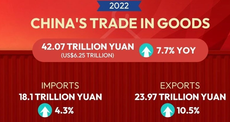 - China had record trade! Yup, China’s total international trade in 2022 was whopping ¥42 or $6.3 trillion! Trade was up 7.7% from 2021. (Don’t say that China’s numbers are rigged! LOL. All foreign trade numbers are verified by other countries).