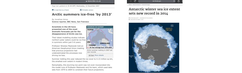 For example, in 2007, scientists claimed that the Arctic Sea will be free of ice by 2013 due to global warming! Well, that didn’t happen. Worse, in 2014, down in the south pole, Antarctic Sea had a record amount of ice!