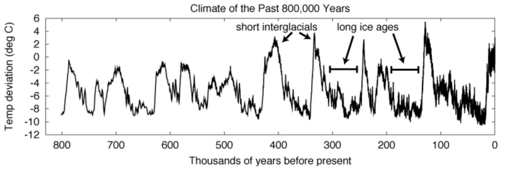 Okay, here is a chart of the temperature deviation over the last 800,000 years: