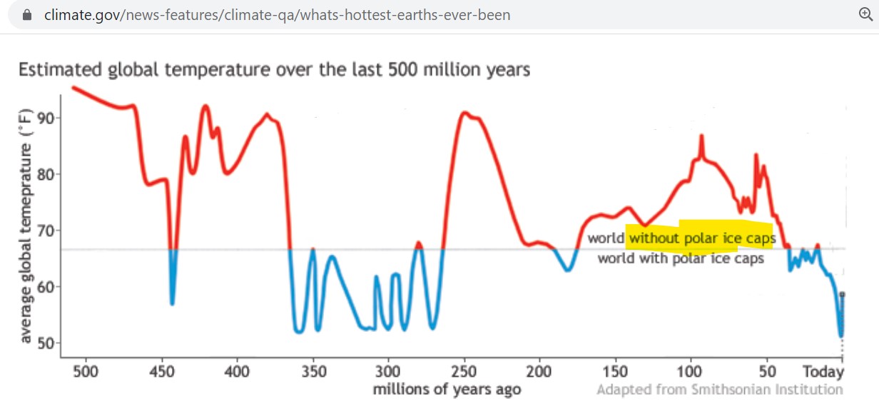 Let’s take a bigger view and look at the global temperature over the last 500 million years. It varied from 50-100 degree Celsius! More importantly, you can see that sometimes there was no ice in the north and south poles — represented by the red lines — and it went back and forth numerous times.