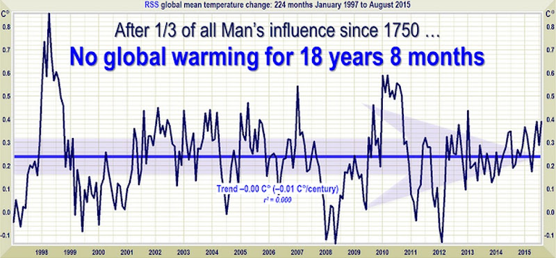 Later on, there was another RSS (satellite) data showing that the global temperature had been flat or even cooling a bit over a period of almost 20 years — from 1997-2015!