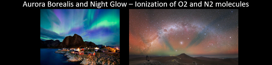 The beautiful aurora borealis is caused by electrons from sun ionizing O2 and N2 molecules and causing the latter to emit lights. “The green we see in the aurora is characteristic of oxygen, while hints of purple, blue or pink are caused by nitrogen.”