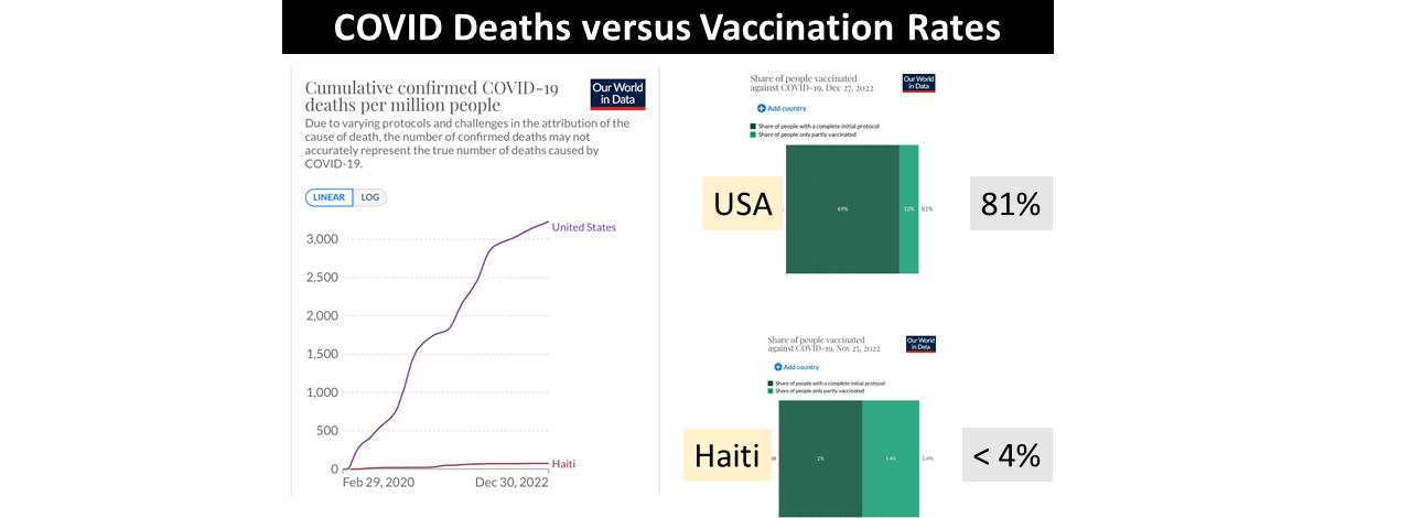 Now tell them, “Look, here is a proof that vaccination kills people. The US has a vaccination rate of 81% and Haiti is under 4%. And look at the shocking number of deaths in the US compared to Haiti. It’s obvious that mRNA vaccines kill.”