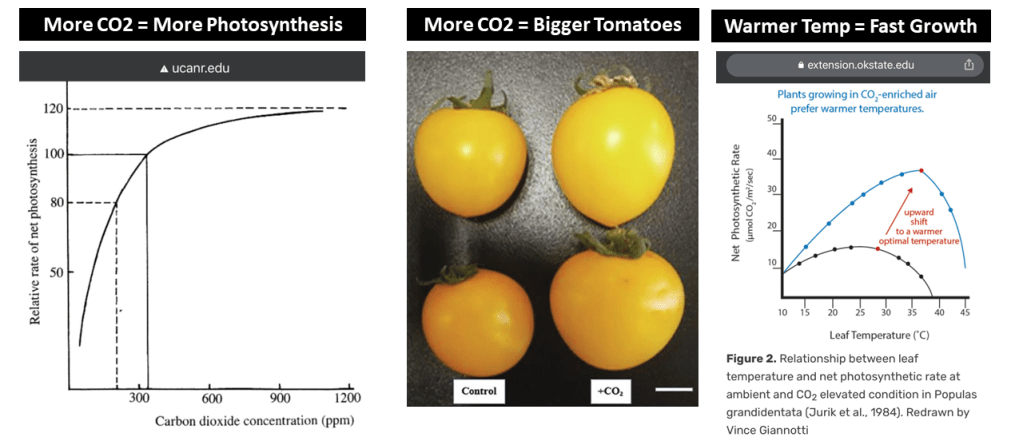 Here is a scientific paper on how increased CO2 in a greenhouse increased yield of tomatoes and made them bigger. The plants grew faster and bigger! Here’s an article on how CO2 increases photosynthesis — the positive relation works up to about 1200 ppm of CO2, which is 3x the current concentration on earth. And, not shockingly, warmer temperature equals faster growth for plants! Thus, CO2 and global warming are a great combo! LOL. Some charts and photos from the above links are shown below:
