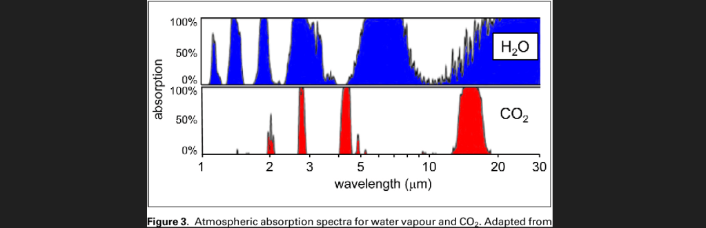 2. The greenhouse gases (GHG) also do not absorb all the infrared waves. Each gas a preference for certain radiations at certain frequency (or wavelength). Thus, CO2’s absorption is the best only for radiations at 15 micron (μm) wavelength. All other wavelengths are practically ignored.