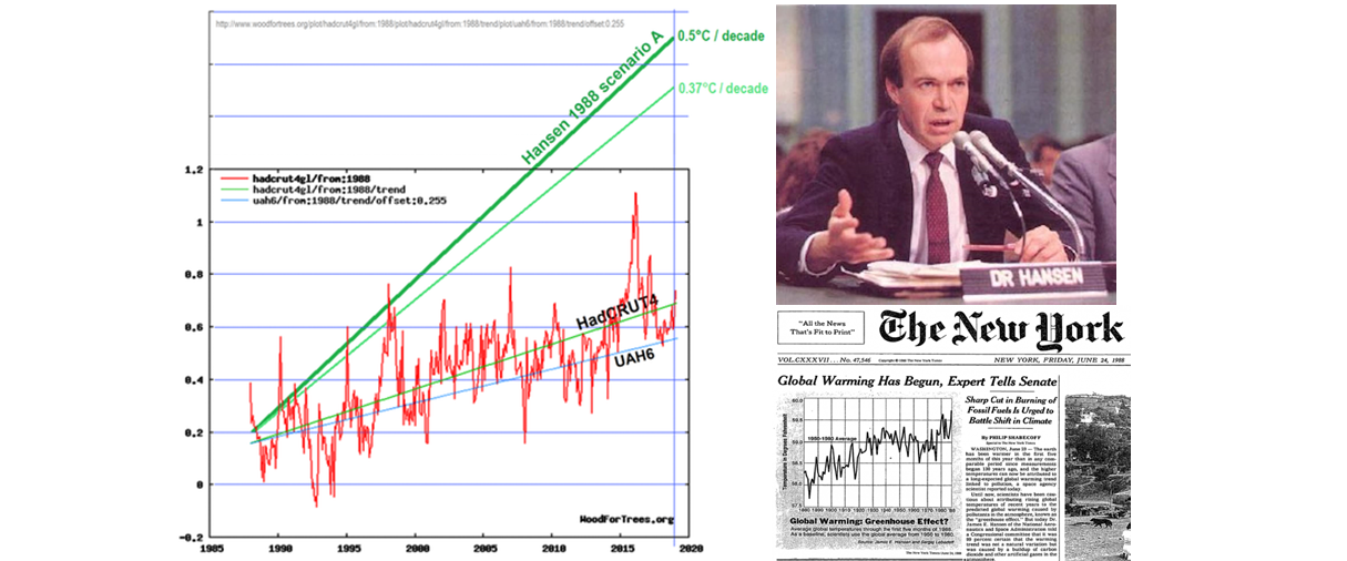 In 1988, the celebrity NASA guy James Hansen published an epochal paper that led to creation of IPCC and billions of dollars of funding for the doomsday cottage industry. In that paper, Hansen predicted a rise of 0.5°C per decade if CO2 emissions were high (he called it Scenario A or Business as Usual).