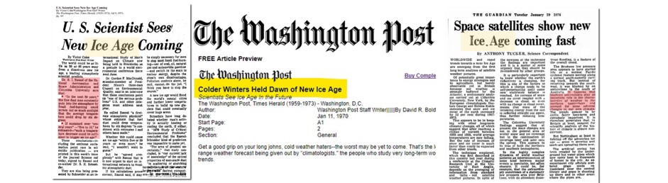 Let’s not forget that before “climate change” and “global warming,” scientists scared the hell out of people by talking about the “coming ice age” in the 1960s and 1970s. Mainstream media, scientists and top government organizations — National Academy of Sciences and NOAA — talked about the “coming new ice age.” The warnings and predictions were stunning: Ice age within 50-60 years; and the world running out of food by 1980!