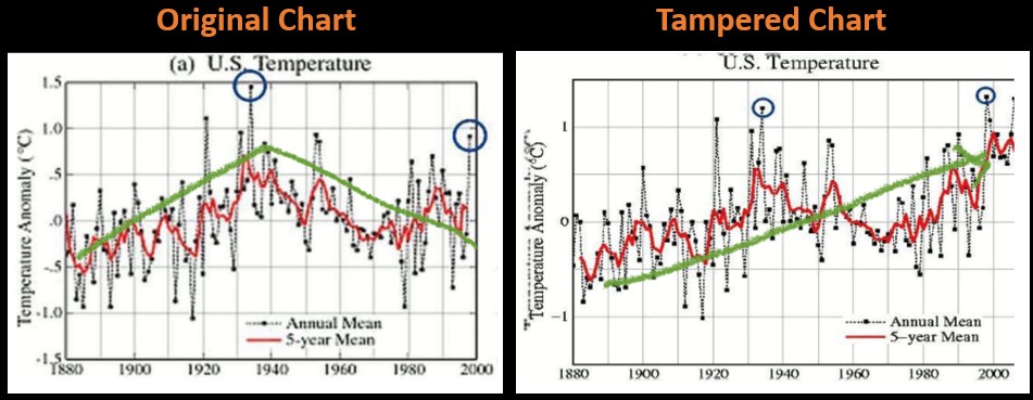 You will be surprised how easy it is for scientists to blatantly change all the past data to create a nice warming trend! For example, in 1999, there was a shocker: “US land temperature had not changed in the 20th century… and had in fact cooled a bit in the previous 50 years!” This was acknowledged by the famous NASA director James Hansen in a blog that was later deleted by NASA. But, thanks to the internet archive, you can find it here. In that 1999 paper, “Whither U.S. Climate?” the authors admitted that: