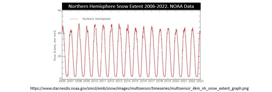 Interestingly, these people also reject ANY positive news. They just wallow in misery and exaggeration. For example, if you show the chart below, it would really upset the climate believers. This is the time series of snow extent in the earth’s entire Northern Hemisphere over the last 17 years (2006-2022). This is from the the US NOAA and as official as it gets. There is no climate emergency or global warming in this chart.