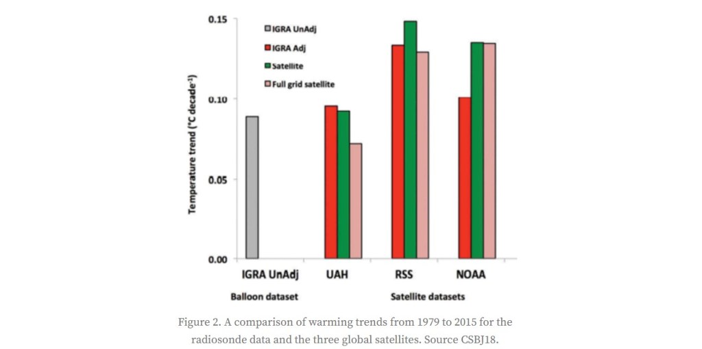 Finally, satellite data need tons of fudging! There is no simple way to match microwave data to temperature. For example, every satellite has different orbits, sensors, technology, instruments and calibrations. Thus, an American satellite will have different data from a European satellite; and a 2022 satellite will have different data when compared to a 1999 satellite! Then there are numerous problems with satellite — for example, “drift”, meaning that a satellite won’t be at the precise position above earth every time, leading to false data.