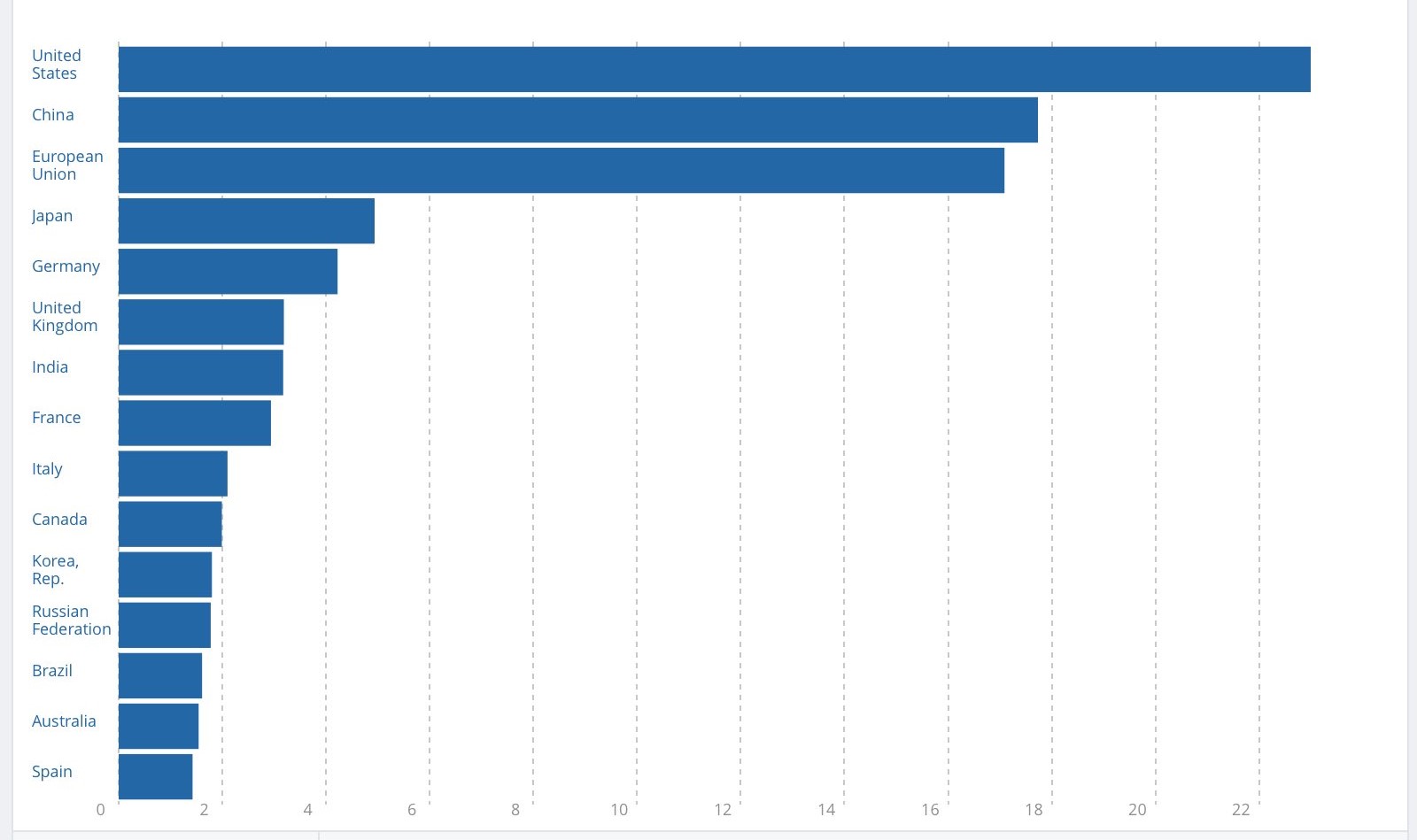 As for Peter’s claim that China is “significantly smaller than the US,” here is the 2021 GDP chart. China is actually larger than the entire EU! In 2022, China’s GDP was $18 trillion.
