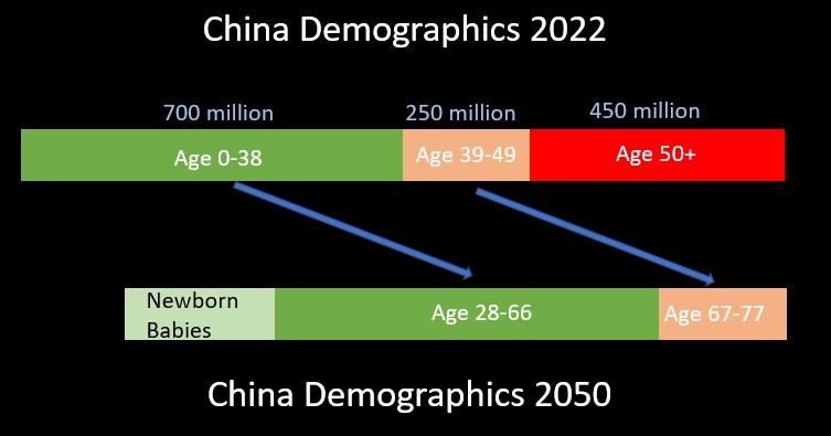 Life expectancy in China is already 78. Even if we assume that the life expectancy stays the same, it means that only people now aged 50 and above will be dead by 2050. As shown below, Chinese people below the age of 50 now will be alive in 28 years (i.e. by 2050).