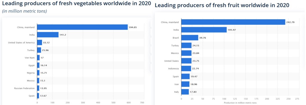 Below are the charts of China’s production of vegetables and fruits. China surpasses other nations by a huge margin — including India, whose population will be larger than China’s this year.