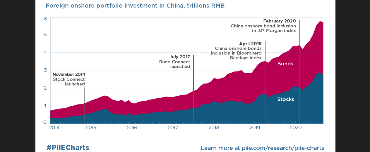 In the beginning of 2022, foreign investors held about ¥4 trillion (equivalent to $640 billion) of Chinese bonds (link) and an almost equal amount of Chinese stocks (link).