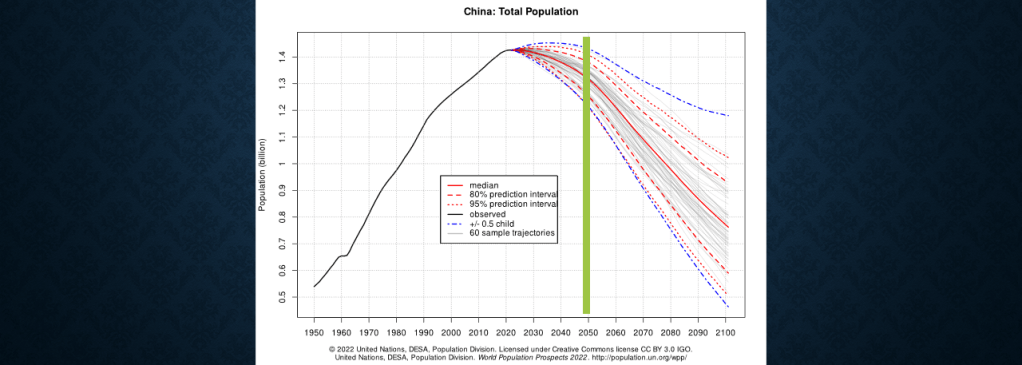 To be scientific and objective, the UN forecast for China’s 2050 population is between 1.2 to1.4 billion.