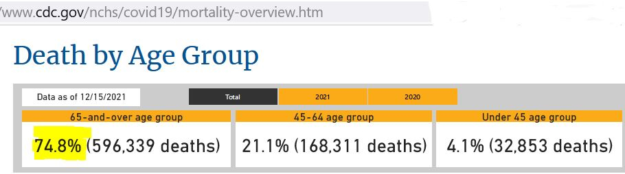 Fast forward two years and the data still remains almost identical. Here’s the CDC data for covid death by age group, as of Dec 15. People above the age of 65 still constitute 75% of covid deaths. Basically, nothing has changed in this aspect in two years.