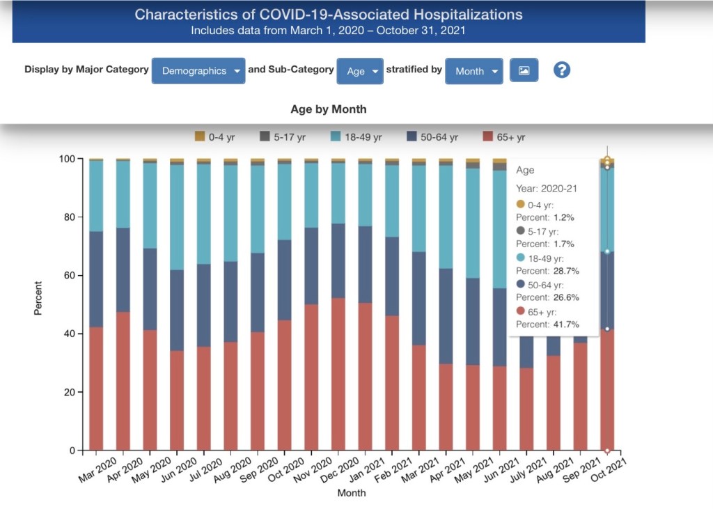 COVID hospitalization by age and by month (Mar 2020 – Oct 2021)