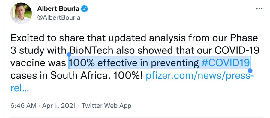 In April 2021, Pfizer’s Chairman/CEO tweeted that vaccines were 100% effective in preventing covid. In other words, not a single vaccinated person would even get infected — let alone get sick or die.