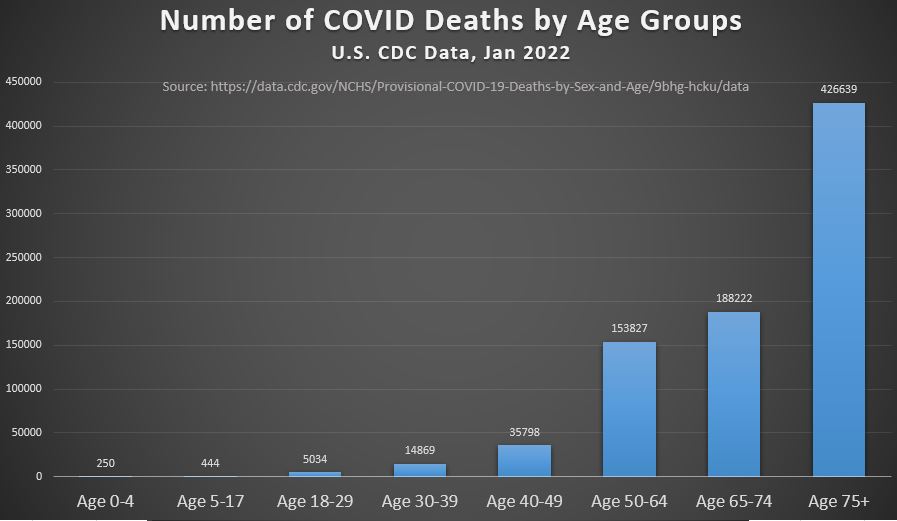 COVID19 deaths by age groups. United States CDC Data, Jan 2022