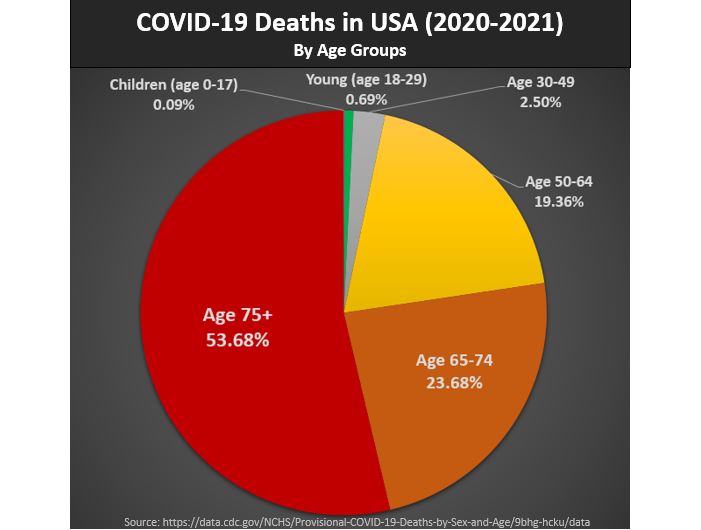 From the same CDC data, you can create a pie chart, which shows how 93% of covid deaths happen in people above the age of 50. Children (0-17) do not account for even 0.1% of the deaths. People above the age of 50 account for whopping 96% of deaths.