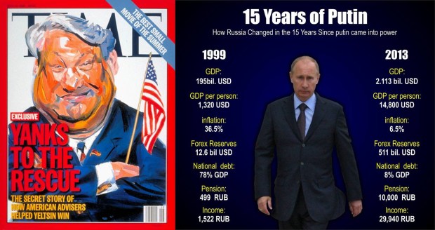Throughout Yeltsin years, the experts from the US kept destroying Russia’s economy. To give a sense of the insanity, the “liberalization” programs administered by the US experts caused hyperinflation for 4 long years, sometimes of up to 50% per month (or more than 2000% per year).