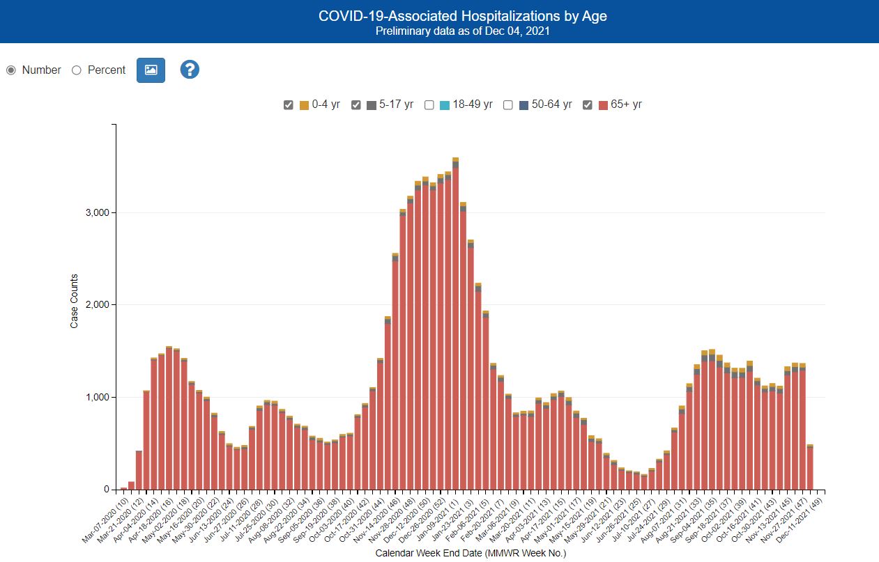 Here’s another chart from CDC on hospitalization of children (age 0-17) versus senior citizens (age 65+). Older people are 25x more likely to be hospitalized than children. So, why bother vaccinating children and subjecting them to mRNA vaccines? We should be focusing on older people with chronic diseases.