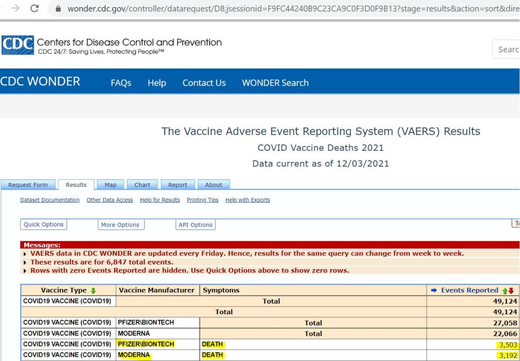 According to the VAERS database of CDC, as of December 2021, there were 49,000 reports of adverse reactions and 6,700 deaths from the COVID-19 vaccines of Pfizer and Moderna.