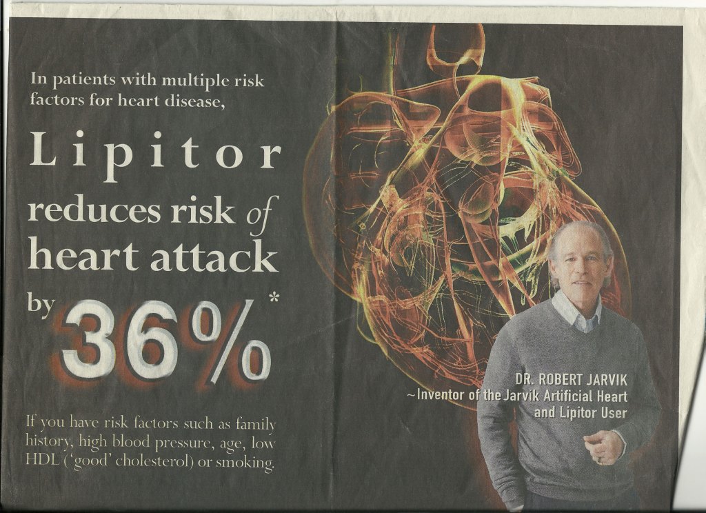 In the published Lipitor trial, 96.9% of the placebo group (no drug) did not have a heart attack. Among those who took Lipitor, 98% did not have a heart attack. So, the ARR was 1.1%. But using the funny math for RRR, the marketing number was 36%. (Here’s the math: The risk went down from 3.1 to 2. Thus, the reduction was (3.1-2)/31 = 1.1/3=36%).