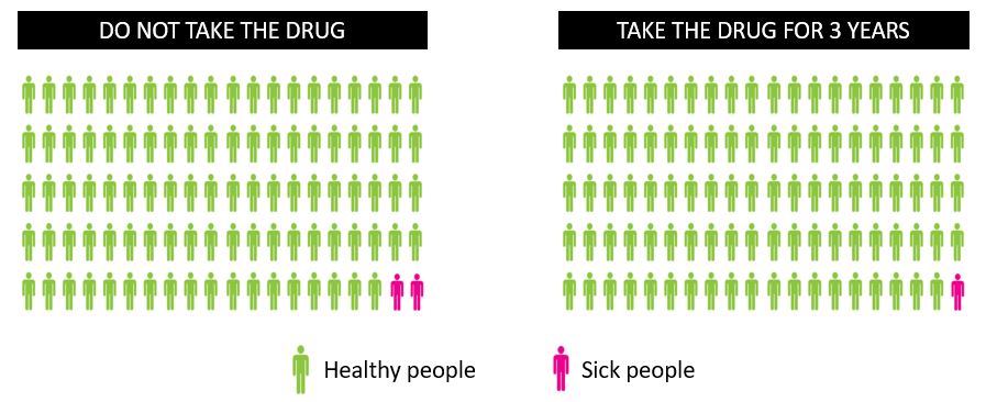 However, if all the 100 people take a drug every day for three years, only 1 will have a heart attack. That is, 99% will be able to avoid the heart attack.